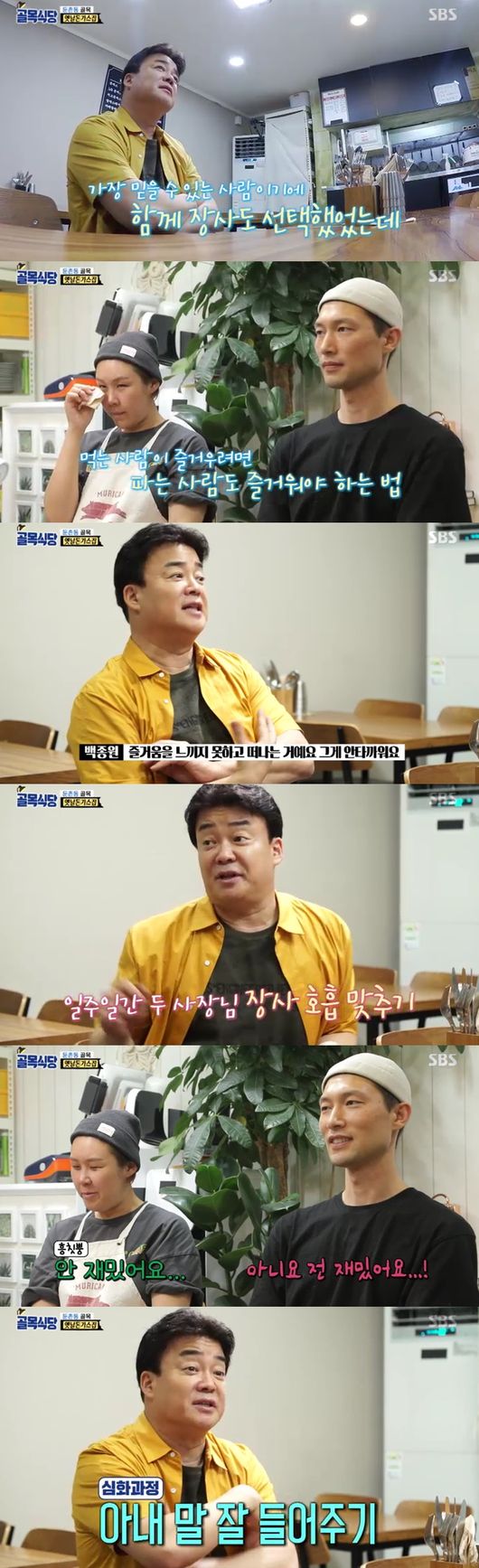 이를 본 MC 김성주는 백종원에게 부부가 함께 장사하는 것이 어떤지 물었다. 백종원은 "권장하지 않는다"면서 "나는 한다, 나는 좋지만 말리는 편, 어떻게보면 장사는 전쟁터라 남편이 신경이 곤두서 있을 것이다"며 두 사람을 바라봤다.