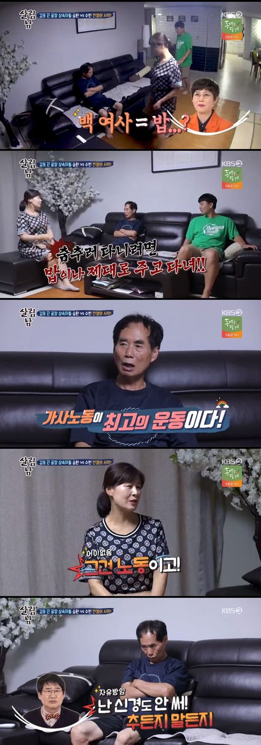 집으로 돌아온 김승현의 아버지는 줌바댄스를 다니는 어머니를 보고 못마땅해했다. 김승현의 아버지는 "춤추러 다닐거면 밥이나 주고 다니라"며 "설거지, 빨래, 청소를 해라. 그게 운동이다"라고 말했다.