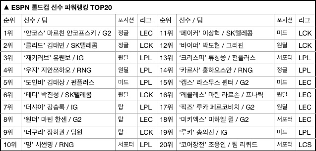 김태민과 함께 파워랭킹에 이름을 올린 LCK 선수는 총 4명이다. SK텔레콤의 ‘테디’ 박진성(6위), ‘페이커’ 이상혁(11위), 담원의 ‘너구리’ 장하권(9위), 그리핀의 ‘바이퍼’ 박도현(12위)이 등록됐다. ESPN은 장하권이 지난 2018년 세계무대 데뷔 후 매번 인상적인 활약을 선보이고 있는 ‘더샤이’ 강승록의 뒤를 잇는 새로운 ‘탑 라인 스타’가 될 수 있다고 보았다. 이상혁에 대해선 “그의 국제대회 관록은 무시할 수 없다”고 전했다.