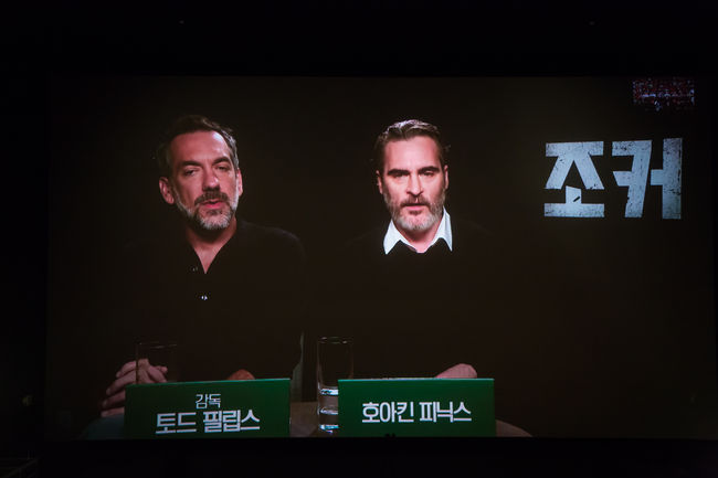 26일 오후 서울 CGV 용산아이파크몰에서는 영화 '조커' 언론시사회 및 라이브 컨퍼런스가 열렸다. 주연 배우 호아킨 피닉스와 연출을 맡은 토드 필립스 감독이 영상을 통해 국내 취재진과 만났다.