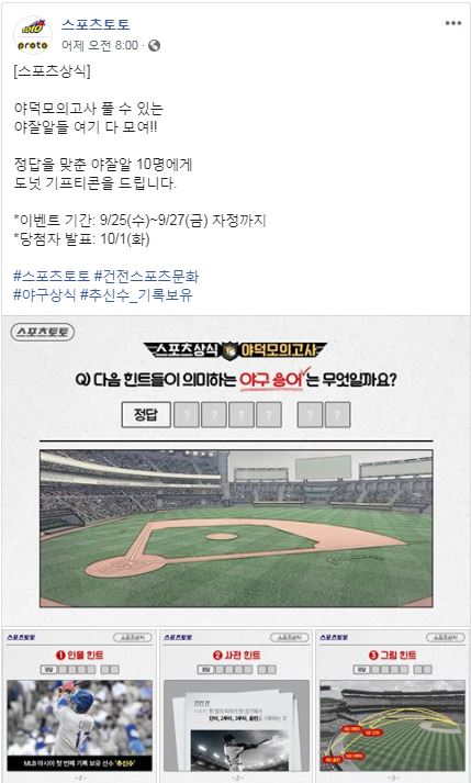 체육진흥투표권 스포츠토토의 수탁사업자인 ㈜케이토토(www.ktoto.co.kr)가 공식 페이스북(www.facebook.com/sportstoto.toto.proto)을 통해 오는 27일(금) 자정까지 프로야구의 용어를 맞히는 ‘토토 스포츠 상식’ 이벤트를 실시한다고 밝혔다.