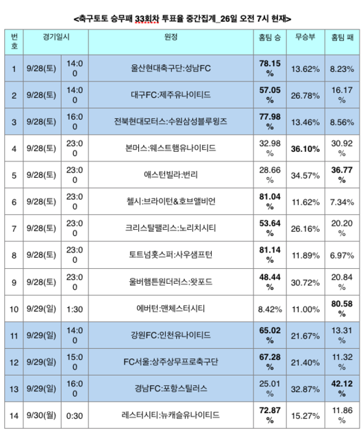 한편, 이번 승무패 33회차는 오는 9월 28일(토) 오후 1시 50분에 발매를 마감하며, 경기가 모두 종료된 후에 결과가 공식 발표된다.