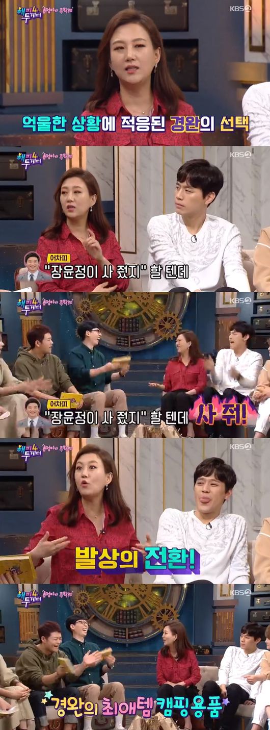유재석은 "최근에는 뭘 사줬냐"고 물었다. 이에 장윤정은 "캠핑 용품이다. 비싸더라"라며 "이럴거면 차라리 캠핑카를 사라고 했다"라고 말해 주위를 깜짝 놀라게 만들었다. 이에 손준호는 "나도 그 얘길 들었다. 근데 도경완씨는 그렇게 하라면 또 못 산다고 한다"며 "으악을 준다라고 하지 않냐. 한 번 으악을 주는 것 같다"라고 말해 웃음을 자아냈다.