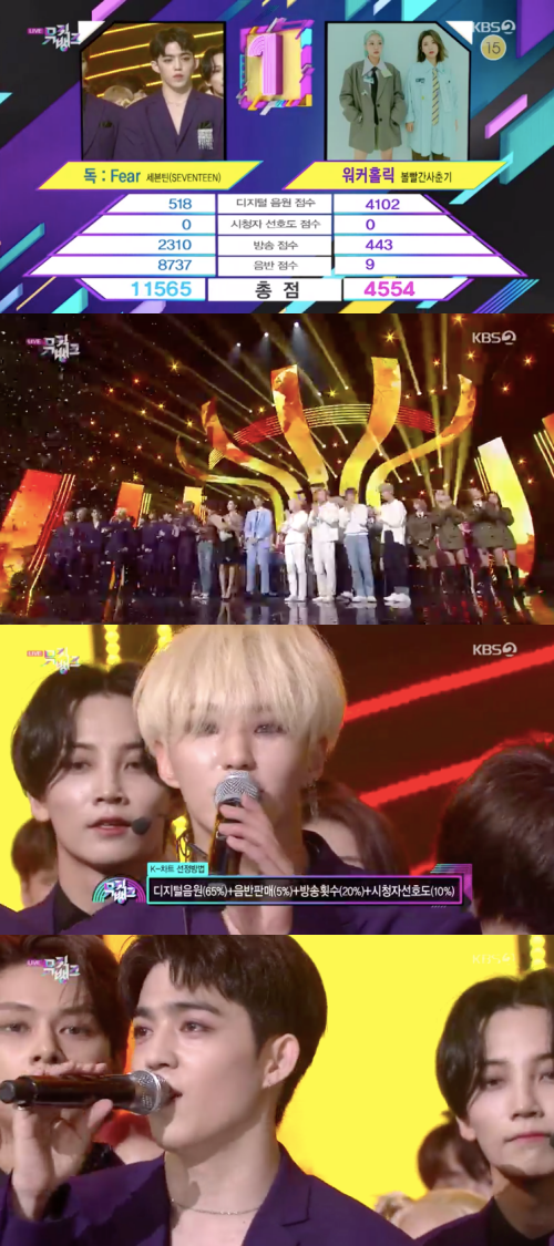 27일 오후 방송된 KBS2 '뮤직뱅크'에서는 세븐틴의 '독:Fear'과 볼빨간사춘기의 '워커홀릭'이 1위 후보로 맞붙었다.