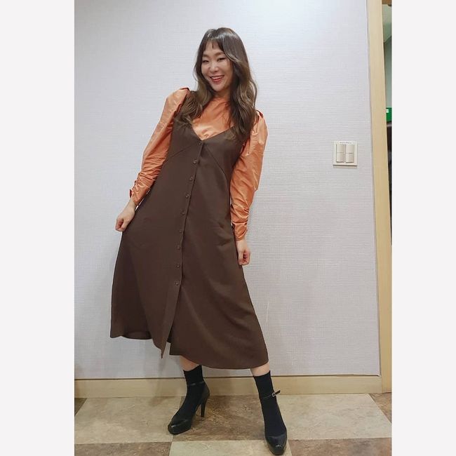 공개된 사진 속 정주리는 주황색 블라우스와 갈색 뷔스티에 원피스를 입고 있다. 정주리는 세 아이의 엄마라곤 믿기지 않을 정도로 날씬한 몸매를 자랑한다.