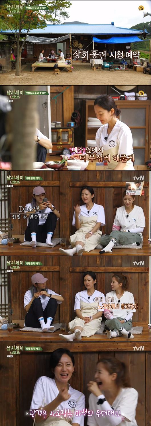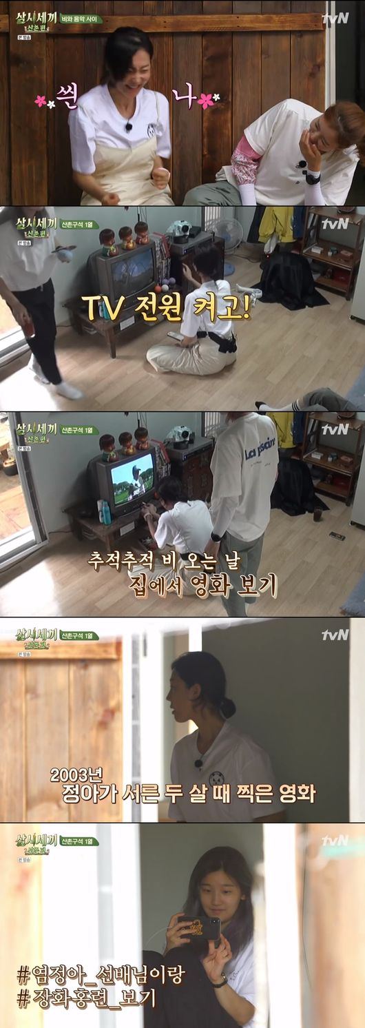 염정아는 "이제 비디오를 보자"라고 제안했다. 세 끼 멤버들은 TV앞에 쪼르르 앉아 염정아가 나오는 공포영화 '장화홍련'을 시청했다. 윤세아는 "언니 이땐 어떻게 이렇게 얼굴이 리프팅 돼 있냐"라고 물었다. 이에 염정아는 "그땐 30대 초반이었다"라고 말해 눈길을 끌었다.
