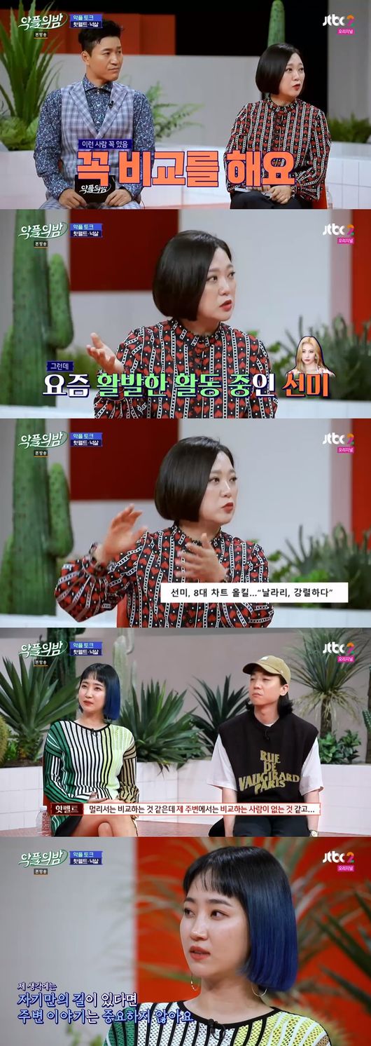 김숙은 "선미가 지금 활발하게 활동하고 있는데 주변에서 비교를 하지 않냐"고 물었다. 이에 핫펠트는 "멀리서는 비교하지만 내 주변에는 비교하는 사람이 없다. 자기만의 길이 있다면 주변의 이야기는 중요하지 않다"라고 말했다.