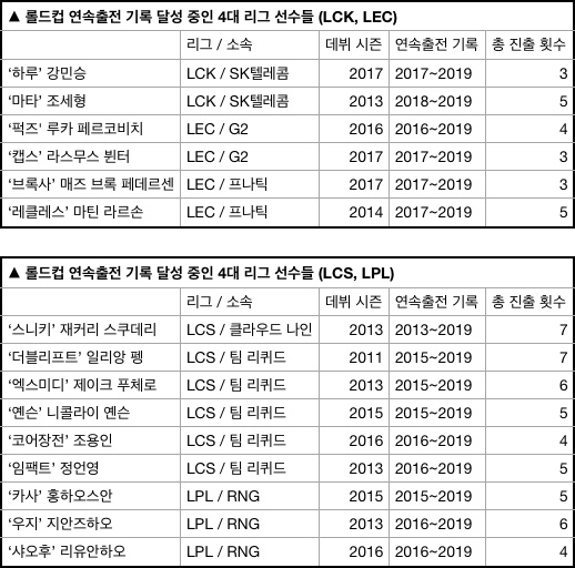 그렇기 때문에 선수들은 롤드컵을 위해 매번 1년 동안 치열한 경쟁을 벌인다. 열매가 달콤한만큼 과정은 매우 힘들다. 실력이 상향평준화 되면서 대회 진출은 점점 어려워지고 있다. 특히 무서운 신예들이 치고 올라온 이후 베테랑들은 ‘연속 출전’ 기록을 점점 달성하기 힘든 상황이다. 이에 OSEN은 2019 롤드컵에 연이어 나선 LOL e스포츠 4대 리그(한국 유럽 북미 중국)의 선수들을 살펴봤다.