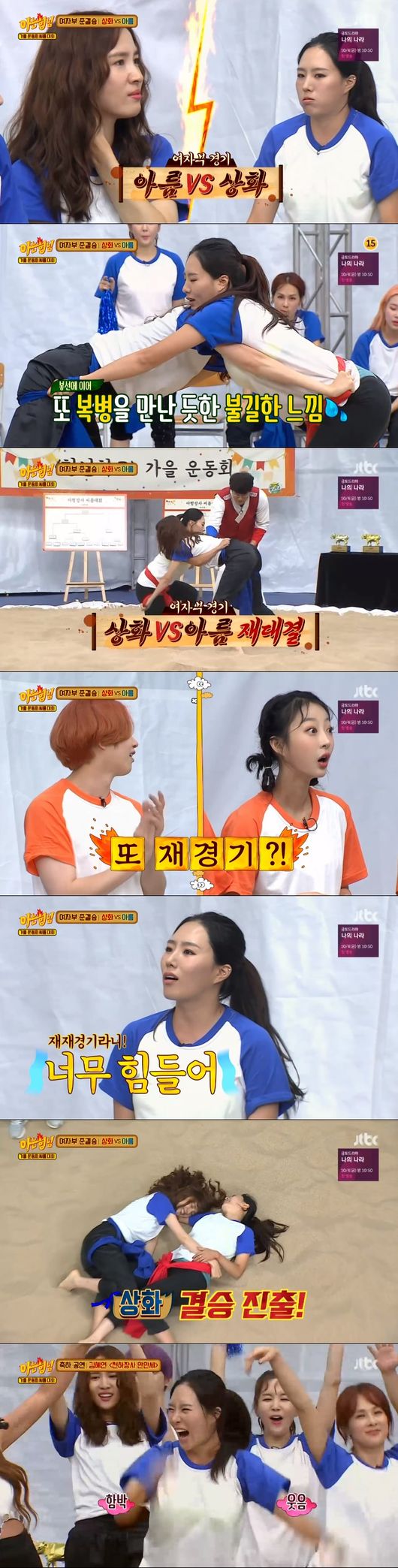이어 혜린과 아름의 대결, 아름의 모습에 강호동은 "보통이 아니다."며 놀라워했고 결국 아름이 승리했다. 이에 강호동은 아름을 보며 "우승 후보"라며 칭찬했다. 여자부 마지막 예선전으로는 봉선과 상화의 대결, 예상보다 팽팽한 게임이 진행됐고, 봉선의 힘에 놀란 이상화는 당황해하며 혀를 내둘렀다.