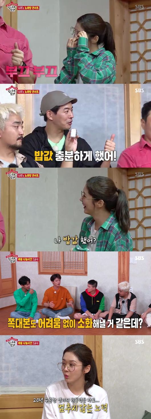 모두 "역시 밥값나라, 밥값 충분하게 했다"며 박수갈채를 보냈다. 분위기를 몰아 장나라는 자우림 노래까지 선곡, 콘서트 분위기로 물들였다. 가수 장나라로 돌아온 장나라 덕 분에 그 시절 감성으로 아련하게 젖어들었다.