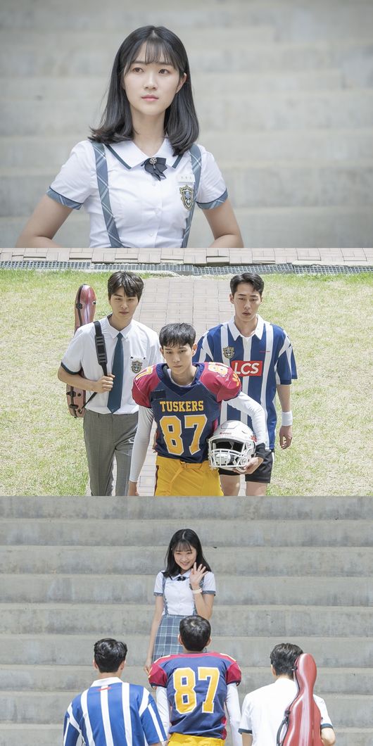 공개된 사진 속에는 은단오와 A3가 마주 보는 순간이 담겨 설렘을 자아낸다. 주변 학생들의 시선을 온몸에 받으며 위풍당당하게 등장한 A3는 혼자 서 있는 은단오를 향해 일제히 다가가며 과연 이들이 어떤 두근거리는 스토리를 만들어낼지, 순정만화 공식에 들어맞는 관계를 형성할지 귀추가 주목된다.