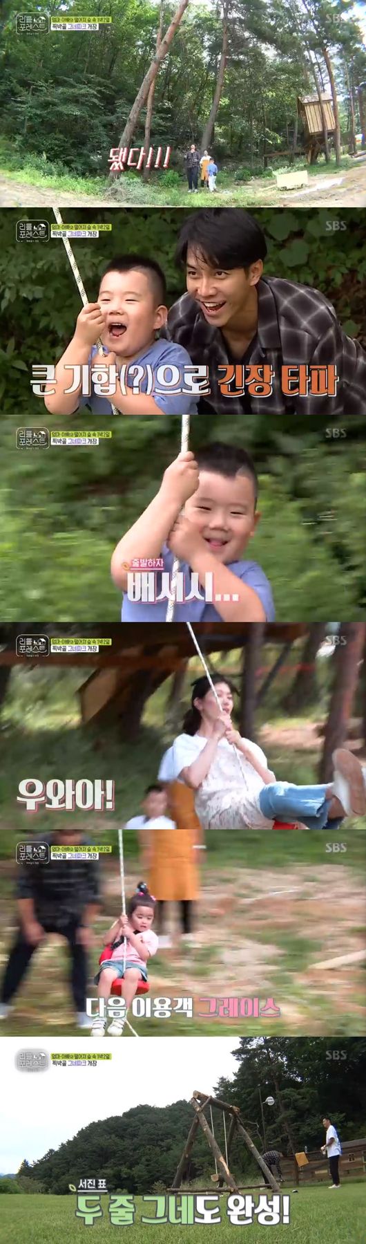 이날 이승기는 "숲속에서 할 수 있는 것들을 많이 누렸으면 좋겠다"며 그네를 만들 계획을 세웠고 이한의 응원을 받으며 외줄 그네를 완성했다. 아이들을 태우기 전 이승기가 먼저 시승을 하고 튼튼함을 확인한 후에 이한이가 가장 먼저 탑승. 이한이는 배시시 웃으며 즐거워했다.