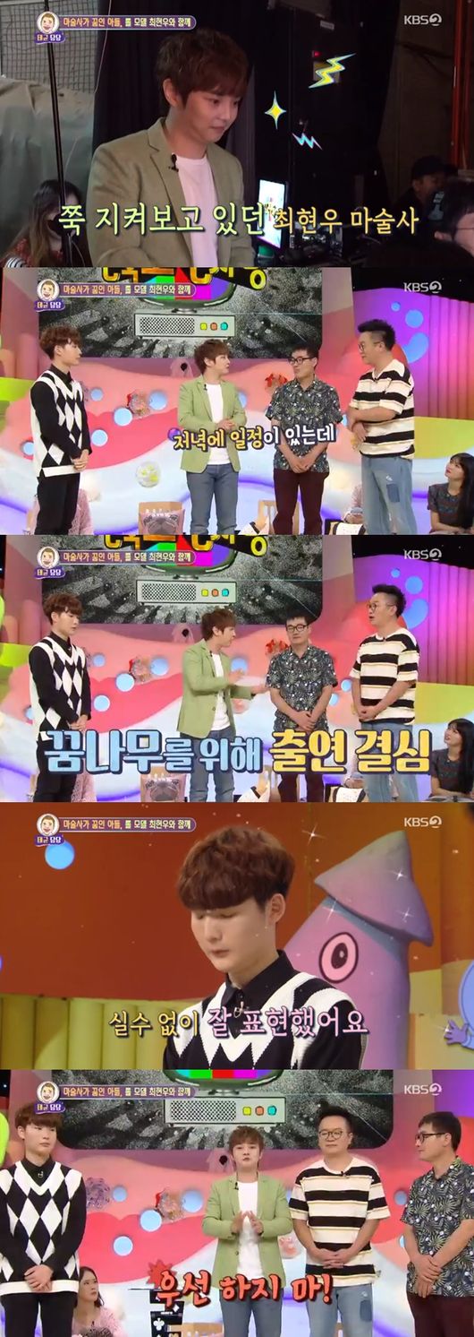최현우는 "솔직히 말씀드리면 하지 말라고 하고 싶다. 젊은 친구들이 좋아하는 것과 잘하는 것을 구분하지 못하는 경우가 많더라. 찜질방에서 친구들과 마술 얘기 하지 말고 더 많은 시간 마술 공부를 해보는 게 좋을 것 같다"라고 조언했다.