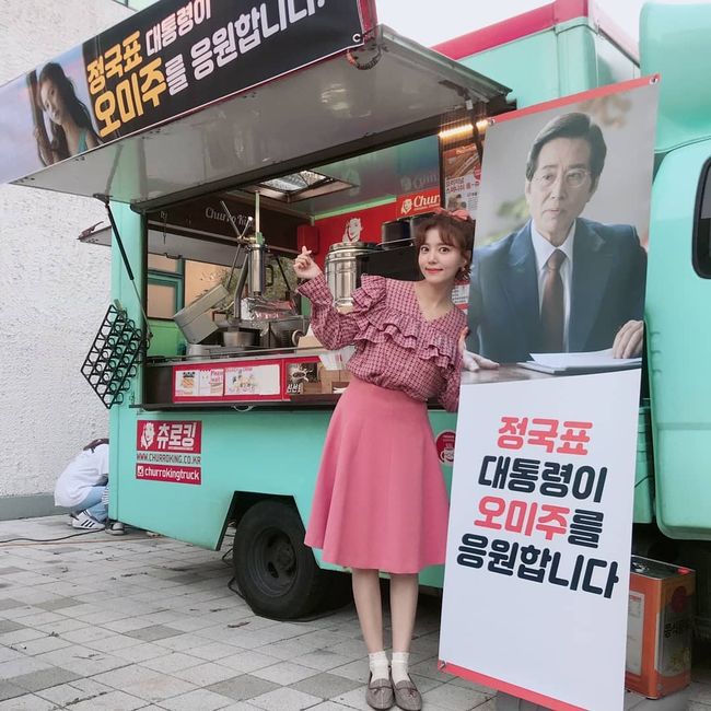 공개된 사진 속 정시아는 백윤식이 보낸 간식차 앞에서 인증샷을 남기는 중이다. 현수막과 입간판에는 '정국표 대통령이 오미주를 응원합니다'라는 응원 문구가 적혀 있다. 이처럼 백윤식은 두 사람이 각자 연기 중인 역할 이름을 활용, 센스 있는 응원을 전했다.