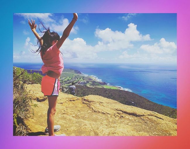 공개된 사진 속에는 산에 올라 만세를 외치고 있는 추사랑의 모습이 담겨 있다. 추사랑 뒤로 펼쳐진 하와이 코코헤드의 절경이 시선을 사로잡는다.