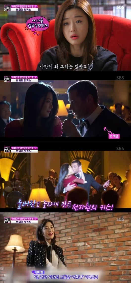 스타들의 의외의 첫키스에 대해 소개했다. 특히 전지현은 극 중에서 첫키스 상대가 배우 김수현이 아닌 우리에게 울버린으로 유명한 할리우드 배우 휴잭맨이라 알려져 놀라움을 안겼다. 바로 2011년에 개봉한 영화 '설화와 비밀의 부채'에서 였다.