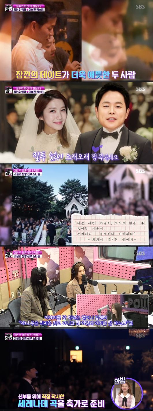 가을의 신랑, 신부가 된 스타들 소식을 전했다. 먼저 SBS 김현우 앵커와 이여진 기상캐스터의 결혼 소식이 실시간검색어를 휩쓸었다. '질투의 화신'의 박신우 PD는 "기자생활 전반에 걸쳐 본인이 궁금했던 걸 물어봤다"면서 술자리가 만들어낸 평행이론을 전했다. 또한 올해초 연인 발전, 결혼 약속해 다가올 12월에 식 올릴 예정이라 전했다.