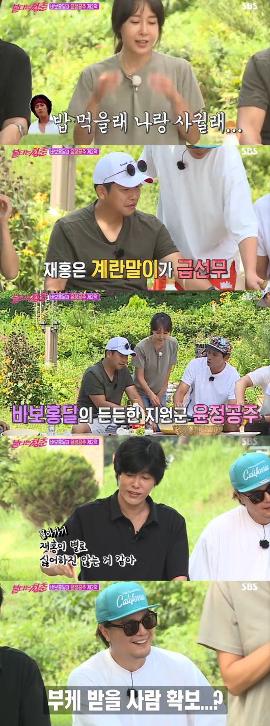 이때, 김윤정과 박재홍이 똑같이 카키색 티셔츠를 입은 것을 발견, "국방생 커플룩"이라며 오묘한 기류를 놀렸다. 최성국은 "재홍이 싫어하진 않아 좋아한다"며 두 사람을 엮기도 했다.