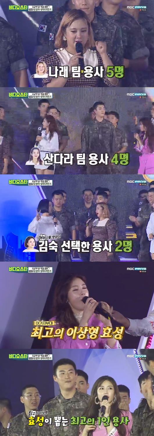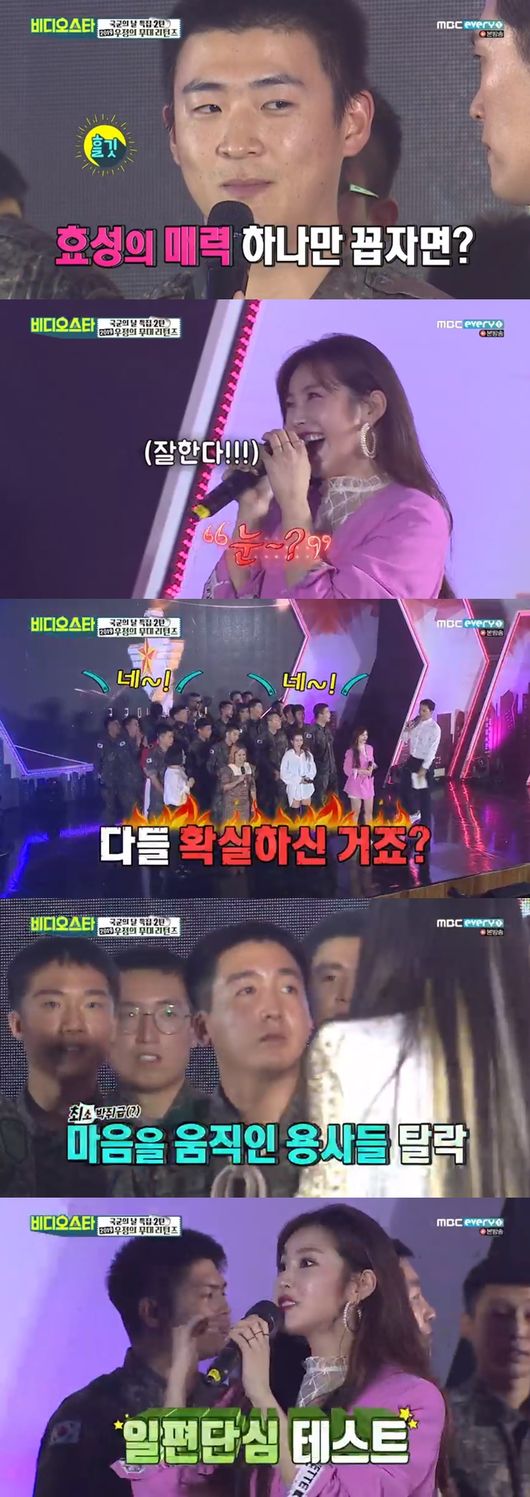1일에 방송된 MBC에브리원 '비디오스타'에서는 이기자 부대 장병들이 뽑은 이상형 1위로 전효성이 선발됐지만 3박 4일 휴가증에는 무릎 꿇고 말았다.