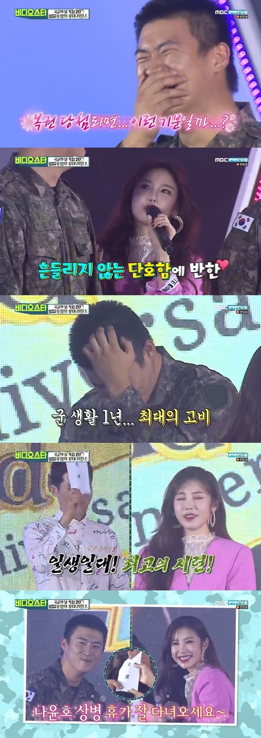 이에 나윤호 상병은 전효성과의 30분 데이트를 선택했다. 하지만 박나래는 "이왕 하는 거 3박 4일 휴가증을 걸어보자"라고 제안했다. 결국 나윤호 상병은 3박 4일 휴가증을 선택해 웃음을 자아냈다. 전효성은 휴가증을 전달하며 "3박 4일 동안 행복했으면 좋겠다"라고 말했다.