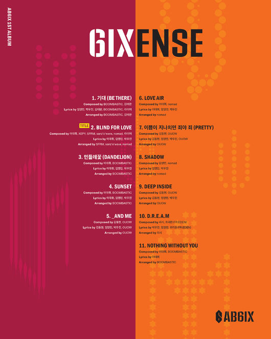 공개된 트랙리스트에는 대세 작곡돌 이대휘가 작곡한 타이틀곡 'BLIND FOR LOVE'를 비롯해, 또 다른 작곡돌 김동현이 작사 작곡에 참여한 몽환적인 알앤비 트랙'DEEP INSIDE', 래퍼 박우진과 임영민의 가능성을 점칠 수 있는 유닛 힙합 트랙 'D.R.E.A.M', 리더 임영민의 세련된 자작곡 'SHADOW', AB6IX 보컬 라인이 준비한 드라마틱한 발라드 넘버 'NOTHING WITHOUT YOU' 등 총 11곡의 앨범 수록곡 크레딧이 모두 담겼는데, 특히 AB6IX 멤버들이 앨범 전곡에 작사 작곡으로 참여한 사실도 공개되며 완성형 아티스트돌로서 남다른 면모를 뽐냈다.