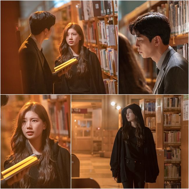 하지만 이후 배수지와 신성록이 어쩐지 차가운 분위기를 드러내며 조우한 ‘도서관 투샷’ 장면이 포착돼 궁금증을 돋우고 있다. 극중 고해리가 검은색 후드 짚업에 블랙진을 입은 편한 차림으로 불이 꺼진 도서관 내부에 나타난 상황. 이어 연신 고개를 두리번거리며 걷던 고해리는 책장들 사이에 서 있는 기태웅을 발견하고 다가간다. 고해리는 책에만 시선을 고정 중인 기태웅을 향해 어렵게 말을 꺼내고, 그제서야 고해리를 바라본 기태웅은 이내 심각하게 대화를 나눈다. 진실 찾기를 위한 같은 마음을 내비쳤던 두 사람이 어째서 난데없는 싸늘한 분위기에 휩싸인 것인지, 국정원이 아닌 어두운 도서관에서 은밀한 만남을 가진 이유에 대해 호기심이 높아지고 있다.