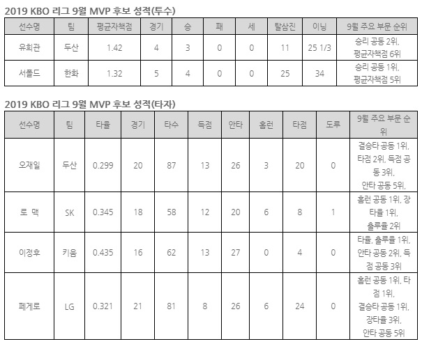 9월 이후 리그 최종까지의 성적으로 선정된 9월 MVP 후보는 투수 두산 유희관, 한화 서폴드, 타자 두산 오재일, SK 로맥, 키움 이정후, LG 페게로 등 총 6명으로 한국야구기자회 기자단 투표와 신한은행 모바일 애플리케이션 '신한SOL(쏠)'에서 실시하는 팬 투표를 합산한 점수로 최종 선정된다.