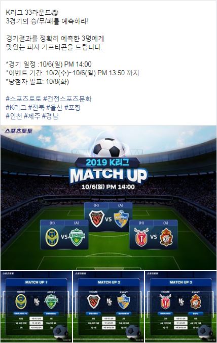 국민체육진흥공단이 발행하는 체육진흥투표권 스포츠토토의 수탁사업자인 ㈜케이토토(www.ktoto.co.kr)가 공식 페이스북(www.facebook.com/sportstoto.toto.proto)을 통해 오는 6일(일)에 열리는 국내프로축구 K리그 3경기를 대상으로 승부를 맞히는 ‘MATCH UP’ 이벤트를 진행한다.