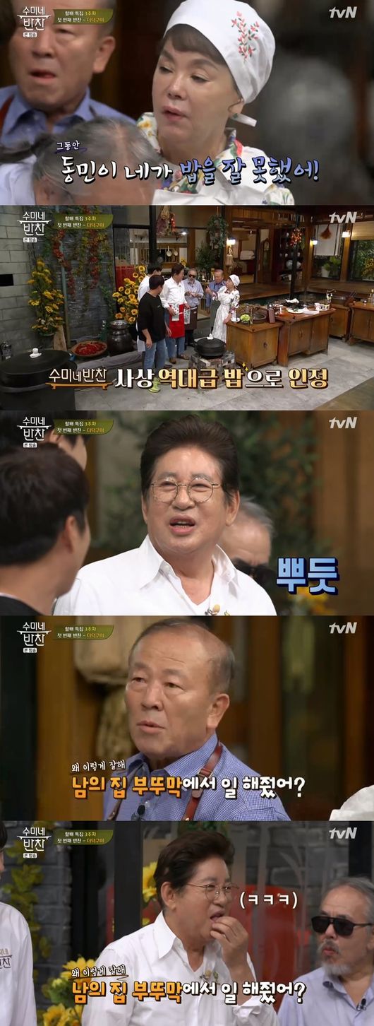결국 김용건이 완성한 밥은 완벽했다. 밥을 맛 본 김수미는 "너무 맛있게 잘 됐다"라며 감탄했다. 이어서 김수미는 "동민이가 지금까지 밥을 못했다. 내가 먹었던 밥 중에 제일 맛있다"라고 말해 주위를 웃음바다로 만들었다. 임현식은 "남의 집 부뚜막에서 일해준 거 아니냐"라고 농담을 던졌다.