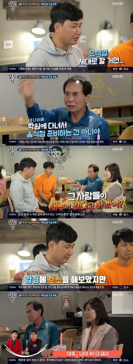 게다가 "고시원에라도 들어갈까 한다"며 제2의 창업계획 발표하자 부모는 "네 나이에 학원 다녀서 음식점 준비는 아니다"며 반대했다. 승환은 "나보고 재능있다고 하더라"고 하자, 父는 "나이 사십이 되어서 아직도 세상물정 모르냐"며 한숨만 쉬었다.