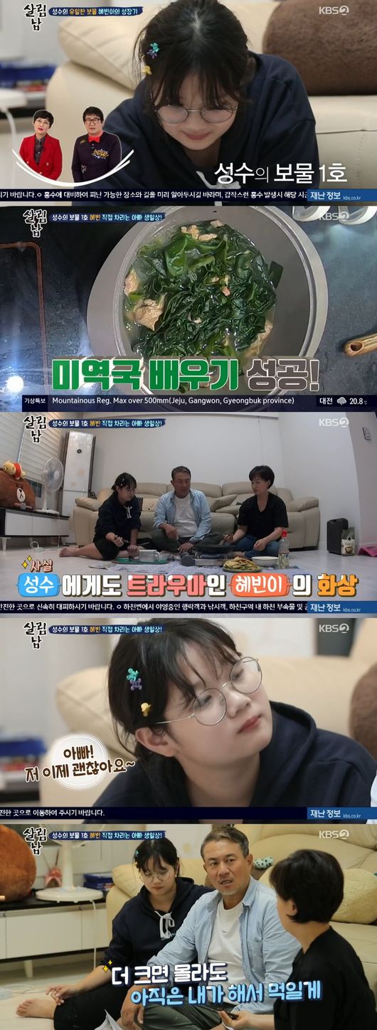 이때, 김성수가 귀가해 집에 도착했다. 김성수는 "불 무서워해, 이런거 하면 하면 안 된다"면서 "크면 몰라도 아직은 내가 해서 먹이겠다"며 혜빈의 트라우마가 남아있는 것을 걱정했다. 고모는 "그래도 천천히 해야한다"면서 생일상 요리를 혜빈과 마무리했다.