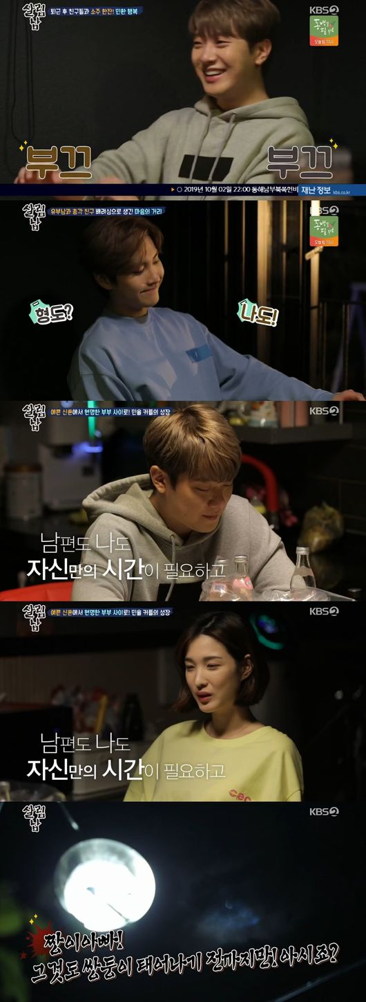 민환은 맛있는 음식 앞에서 "아내가 좋아할 것 같다"며 아내를 생각했다. 이를 본 승현은 "아직도 달달해 부럽더라"면서 "사실 너희집 앞을 몇 번 지나갔지만 방해할 까봐 못 부르겠더라"고 했다. 민환은 "오히려 내가 분위기를 망칠까봐 못 부르겠더라"면서 서로를 위해 배려하느라 마음의 거리가 생겼다고 했다.