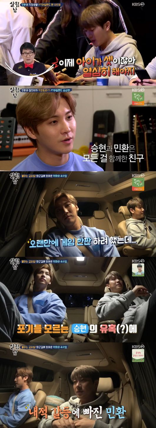 최민환은 FT아일랜드 팬 사인회에서 팬들과의 시간을 가졌다. 팬들은 짱이선물부터 곧 태어날 쌍둥이 선물, 그리고 아내 율희를 챙겨 훈훈함을 안겼다. 이어 함께 10년동안 활동한 멤버 송승현과 함께 차에 탑승했다. 결혼식 때 사회까지 맡아준 든든한 지원군인 승현은 민환이 학창시절 보낼 때 같은 일, 방, 같은 취미로 모든 걸 함께 보낸 친구사이였다.