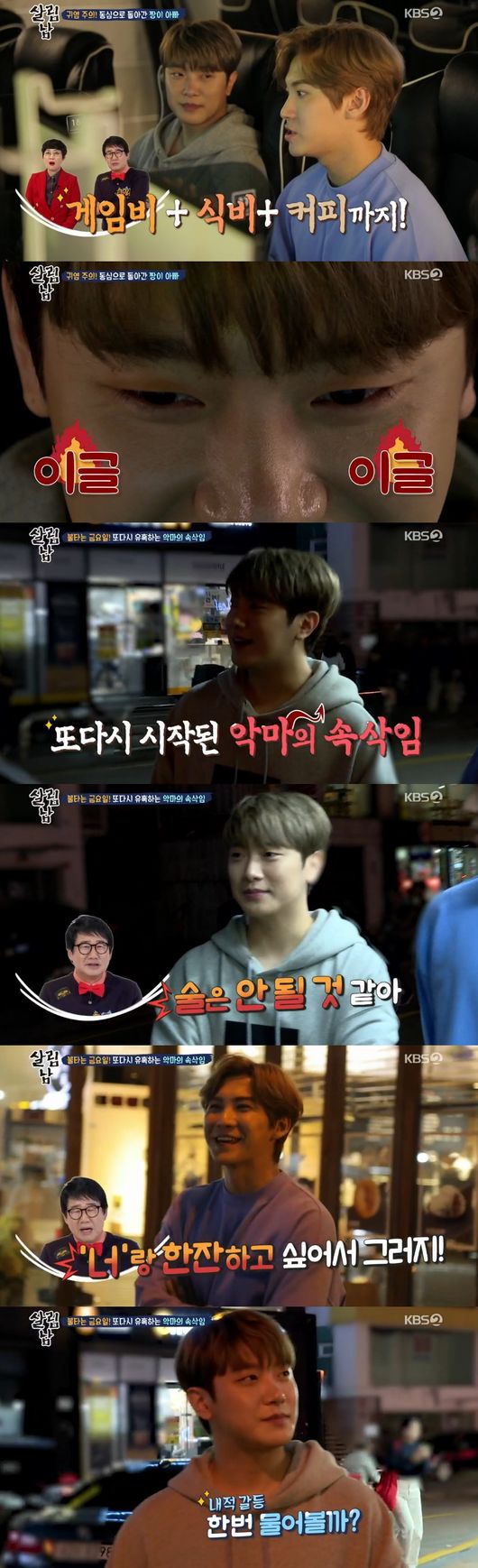 민환은 승현과 게임비에 식비, 커피까지 걸고 자존심 대결 게임을 펼쳤다. 민환이 게임이 지자, 승현은 "실력하락, 가정에 충실한 것이 보여, 넌 좋은 아빠"라고 말해 웃음을 안겼다. 불금에 승현의 또 다시 악마의 속삭임으로 유혹했다. 한잔 하고 가자고 하자, 민환은 "술은 안될 것 같다"며 또 다시 내적갈등에 빠졌다.