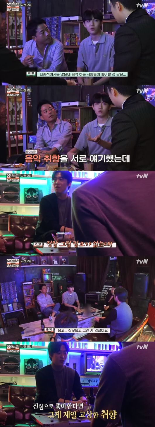이어 전현무는 "음악하는 사람들도 대중적이지 않은 음악을 좋아하는 척하는 경우가 있지 않냐"고 물었다. 이에 김재환은 실제로 그런 사람을 본 적이 있다고 얘기했고 존박은 "음악 취향은 옳고 그른 게 없다. 좋아하는 음악을 들으면 된다"라고 말했다.