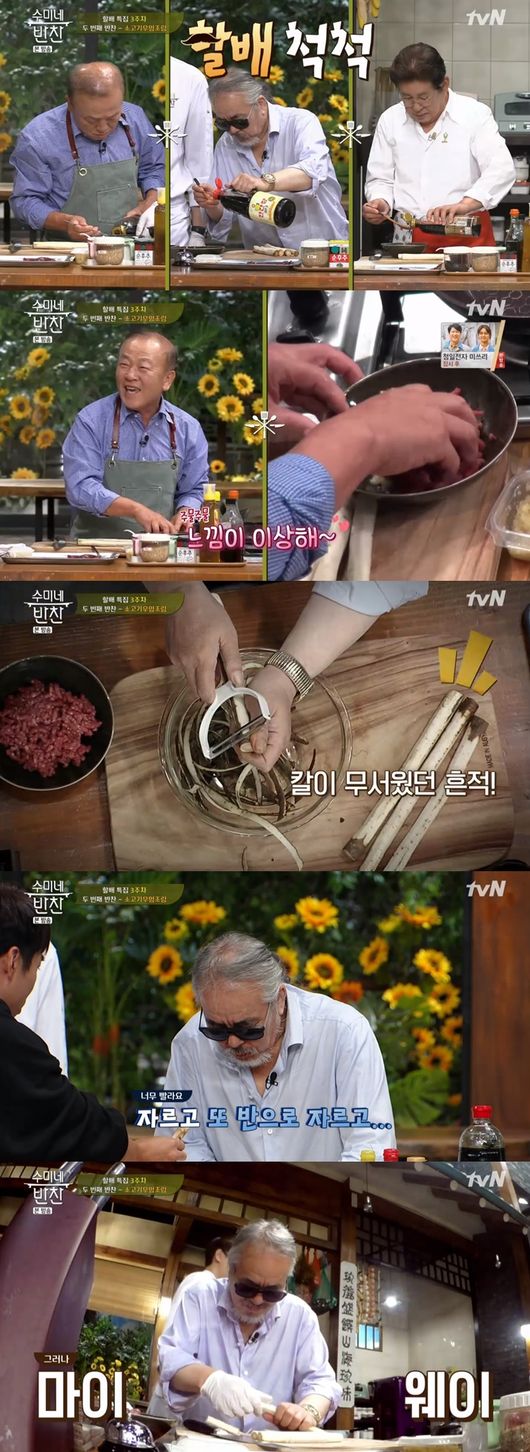 할배 3인방은 김수미의 속도를 따라가지 못하고 저마다 다른 방법으로 요리를 이어나갔다. 칼이 무섭다고 말한 전인권은 우엉을 직접 손으로 잘라 눈길을 끌었다. 급기야 전인권은 종을 누르며 "너무 빠르다"라고 도움을 요청했다.