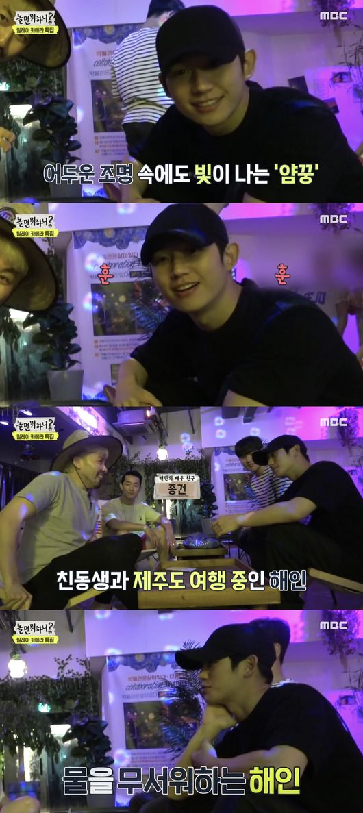그 주인공은 정해인으로 두 사람은 같은 소속사 식구이자 함께 봉사 활동을 다니는 절친한 사이라고. 정해인은 친동생과 지인과 제주도 여행 중이라고 전했다. 그는 노홍철에게 "숙소가 형이랑 너무 가까워서 안 만나기에는 형이랑 제가 싸워야 할 정도"라며 웃음을 자아냈다.
