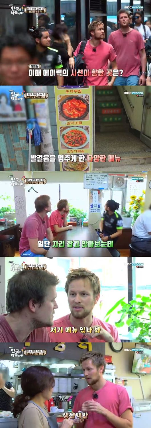 하지만 막상 들어간 식당엔 그림으로 된 메뉴는 없었고 메뉴는 중국어와 일본어만 적혀 있었다. 이때 에이릭이 주문에 나섰다. 하지만 에이릭은 한국어를 알아듣지 못했고 직원은 영어를 할 줄 몰랐다. 직원은 점심시간에 먹는 생선백반을 이야기했고 에이릭은 "어떤 음식이든 나올 것 같다"라며 좋아했다.