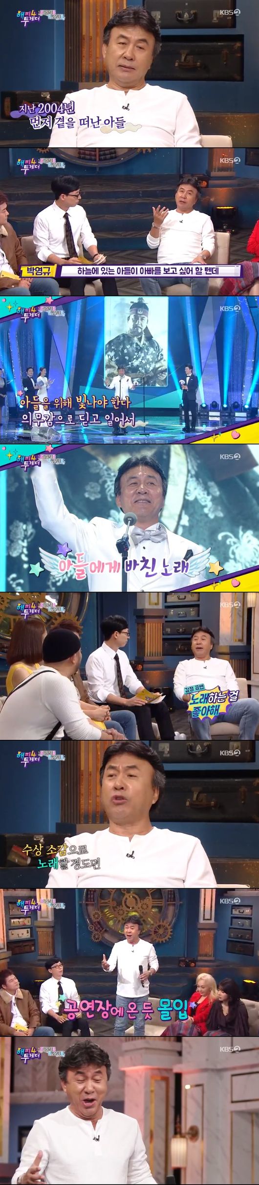 이날 박영규는 “학창시절 성악가를 꿈꾼 적이 있다. 최근 예순이 돼서 다시 성악을 공부하게 됐다”라고 털어놨다. 이어 2014년 연기대상 시상식 당시 우수연기상 수상 후 아들을 위한 노래를 불렀다고 말했고 그때 영상이 화면을 채웠다.