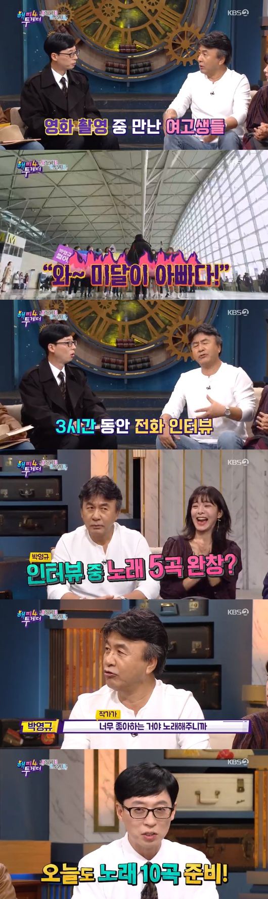 이에 유재석은 "노래 5곡을 부르셨다고 하던데 왜 부른 거냐"며 웃었고 박영규는 "나 노래 부르는 거 좋아해"라고 대답했다. 이어 "작가가 자신의 노래를 좋아했다. 오늘도 10곡 이상의 음악을 준비했다"고 말해 모두를 폭소케 했다.