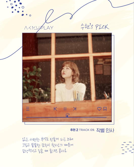 두 번째로 '작별 인사'를 추천했다. 이수현은 직접 편곡에 참여한 '작별 인사'를 수록곡 중 가장 애착이 가는 노래로 꼽은 바 있다. 이수현은 '없는 아련한 추억도 만들게 되는 노래'라며 '그립고 쓸쓸한 감정이 찾아오기 때문에 감성적이고 싶을 때 들으면 좋아요'라고 설명했다.