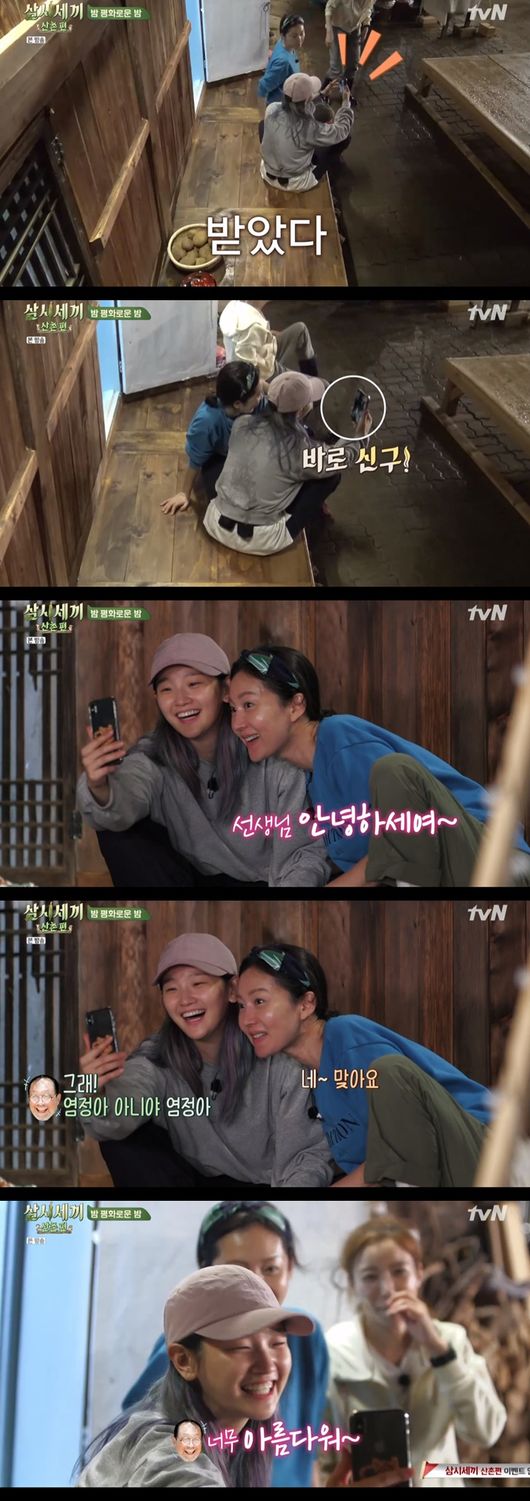 옆에 있던 염정아도 함께 통화하며 반갑게 인사했다. 신구는 "너희 요즘에 '삼시세끼' 하더라. 잘 보고 있다"라고 시청 소감을 전했다.