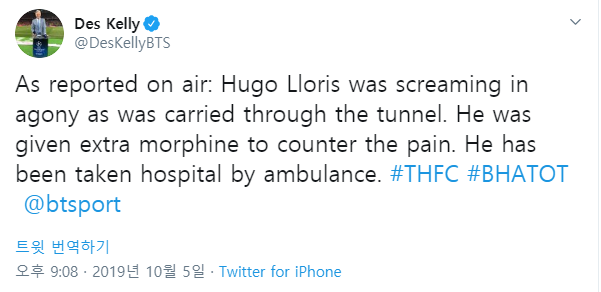 BBC는 전반 종료 직후 "요리스는 터널을 빠져나가면서도 고통을 호소하며 비명을 질렀다. 그는 통증을 가라앉히기 위해 모르핀 주사도 투여받은 이후 구급차에 실려 병원에 갔다"라고 전했다.