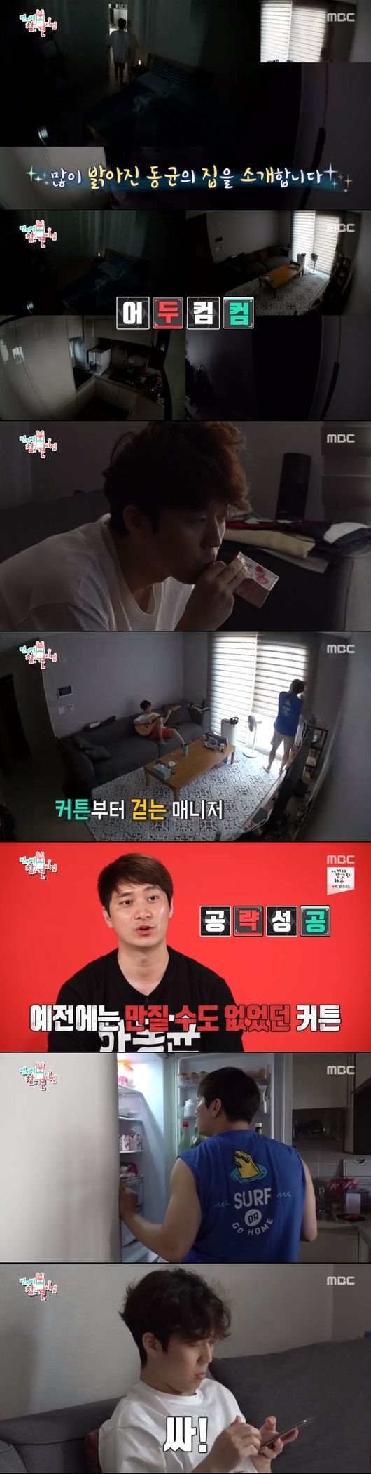 어두운 방에서 자고 있는 모습의 하동균.매니저는 "평소에 암막 커튼을 쳐놔서 어둡다. 그래도 요즘은 빛도 들어온다. 2~3일 정도 방에서 나오지 않은 적도 있다. 거실로 나온 것도 밝아진 거다"고 말해 웃음을 자아냈다.