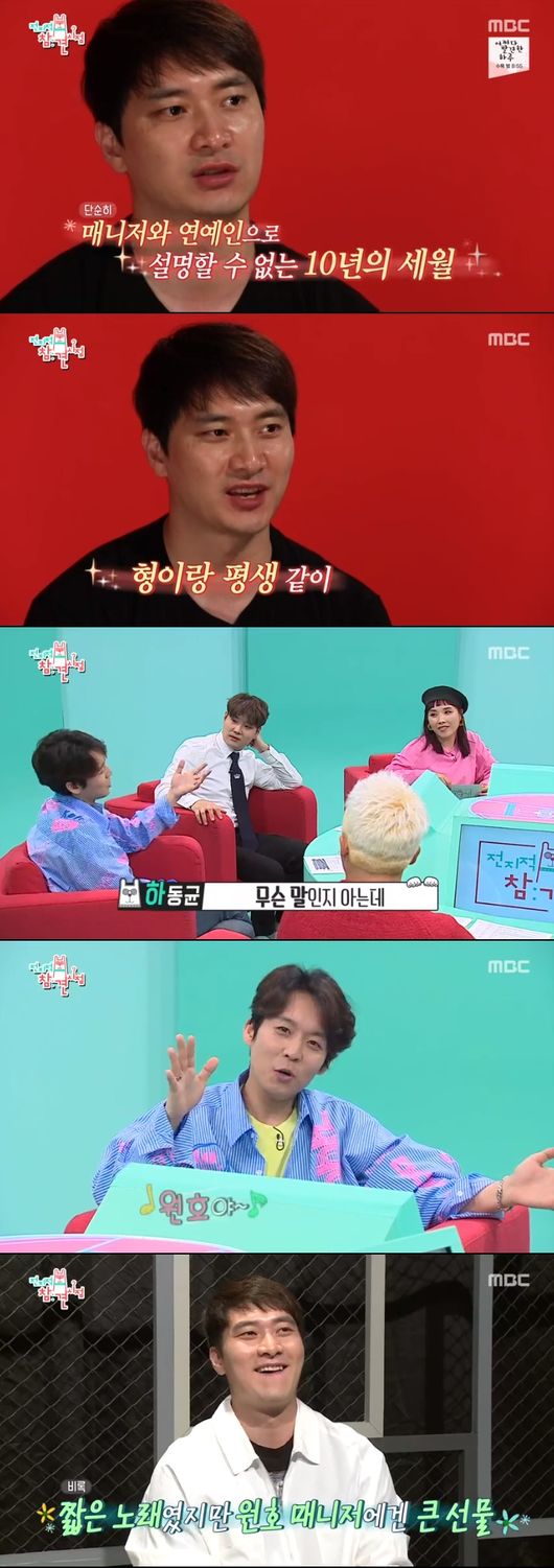 이어 매니저에게 "안 지 10년이다. 둘이서 회사를 하고 있는데 조금더 좋은 모습으로 변하겠다. 편하게 쭉 같이 늙어가면 좋겠다"며 마음을 전했다. 이영자는 "나비야를 매니저 이름으로 불러주면 정말 감동일 것 같다"고 말했고 나비야~를 부르는 게 낯설고 쑥스러워 잘 안 부르게 된다던 하동균은 매니저를 위해 "원호야~ 원호야~"를 불러 감동을 자아냈다.