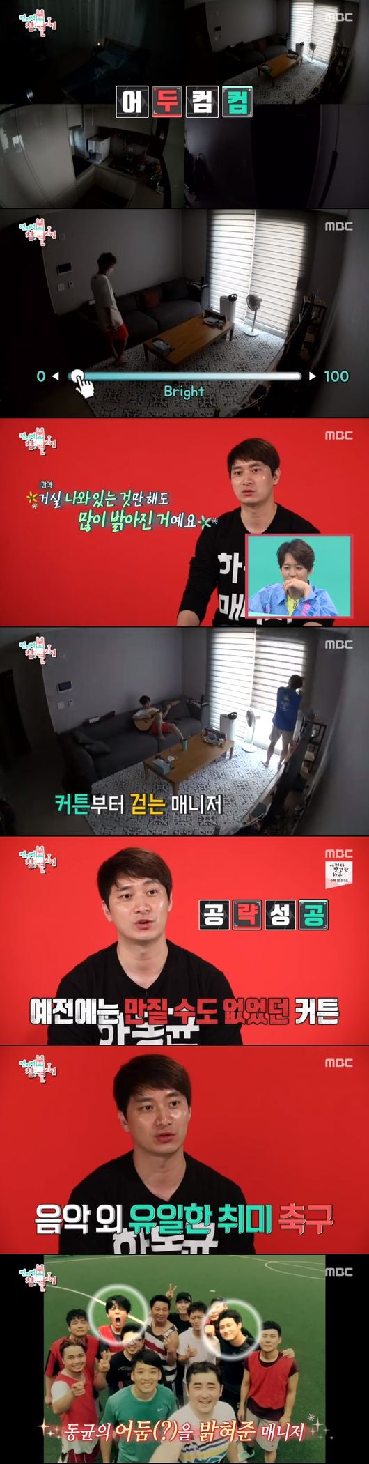 하동균은 살짝 빛이 들어오는 거실로 향했고 이 모습을 지켜 본 매니저는 "평소에 암막 커튼을 쳐놔서 어둡다. 그래도 요즘은 저렇게 빛도 들어온다. 2~3일 정도 방에서 나오지 않은 적도 있다. 거실로 나온 것도 밝아진 거다"고 말해 웃음을 자아냈다.