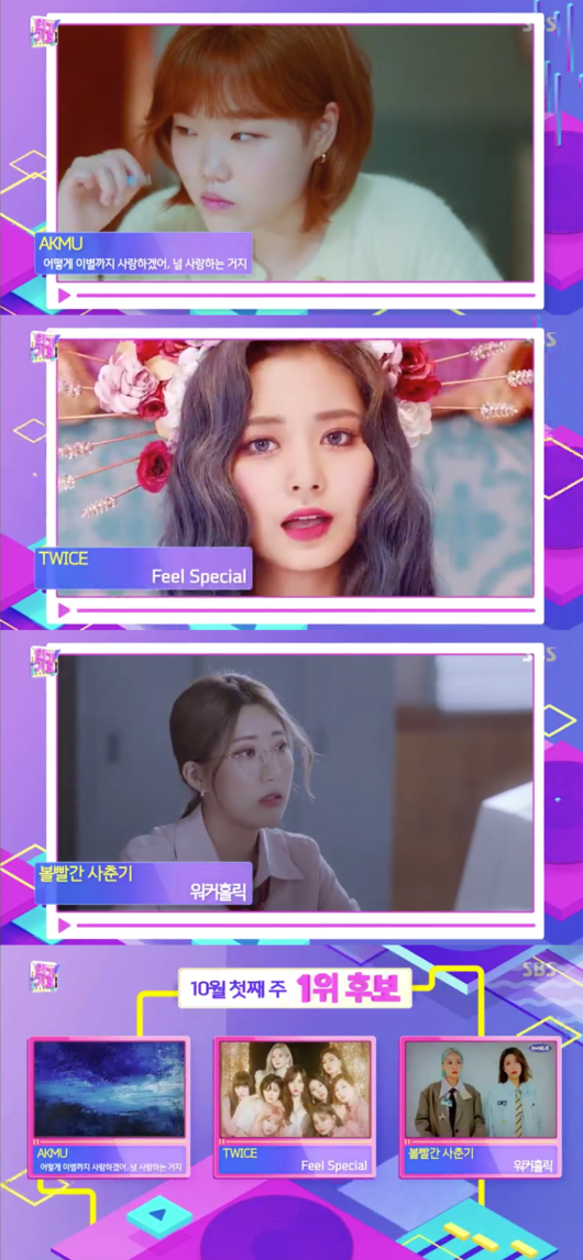 6일 방송된 SBS ‘인기가요’에서 10월 첫째 주 1위 후보가 공개됐다. ‘어떻게 이별까지 사랑하겠어, 널 사랑하는 거지’의 악동뮤지션, ‘필 스페셜’의 트와이스, ‘워커홀릭’의 볼빨간 사춘기가 주인공.