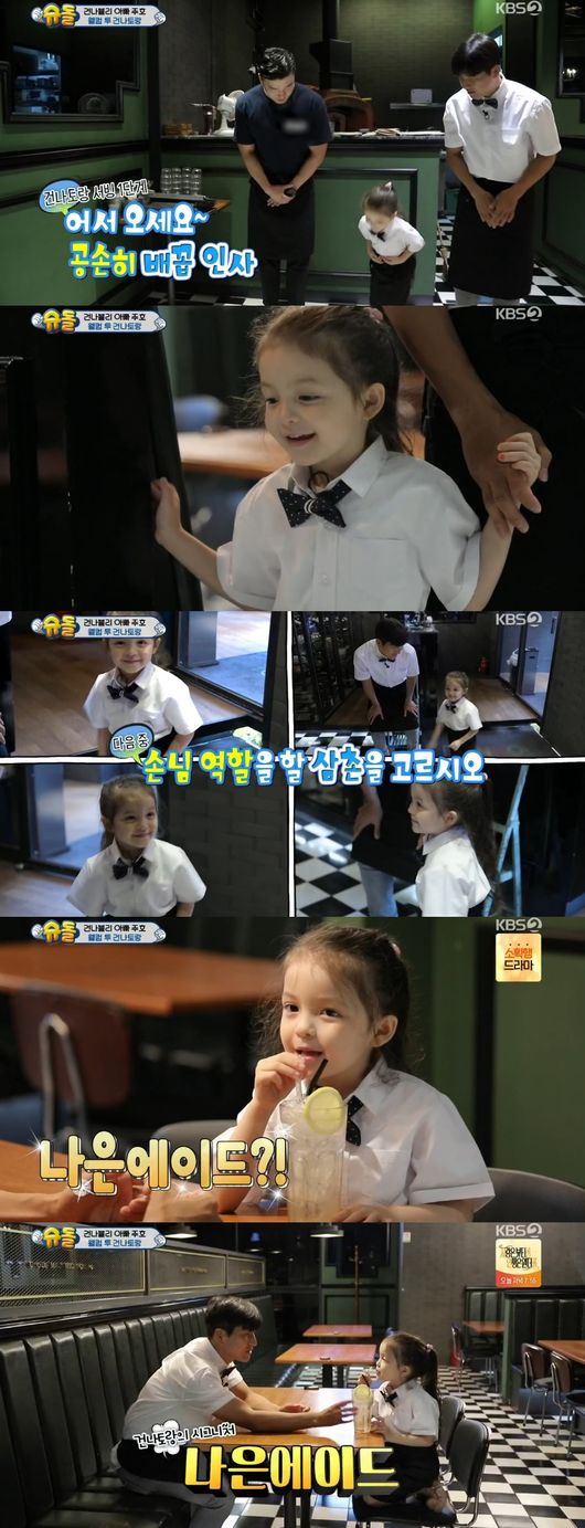 건나블리 아빠 박주호는 아이들과 함께 레스토랑에 향했다. 주체적인 것을 시작했다는 나은이를 위해 주호는 지인을 통해 레스토랑 서빙을 체험하게 됐고, 아빠와 함께 서빙요정으로 변신했다. 나은이는 처음 배운대로 공손하게 인사부터 시작해 아빠 주호의 설명대로 차근히 실행에 옮겼다.