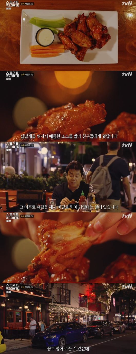 어느 덧 날이 저물었고, 야식을 먹으러 이동했다. 백종원은 "우리가 많이 접하는 음식"이라면서 버펄로 윙을 주문했다. 백종원은 "시큼하고 매콤한 냄새, 하지만 상상하는 그 맛이 아니다"면서 "닭을 튀겨서 매콤한 한소스를 발라놓은 느낌이지만 묘한 매력이 있다, 나도 모르게 엄지를 세웠다"며 먹방을 시작했다. 백종원은 "뉴요커가 된 기분, 꿈도 영어로 꿀 것 같다, 밤이 아름답다"고 말할 정도였다.