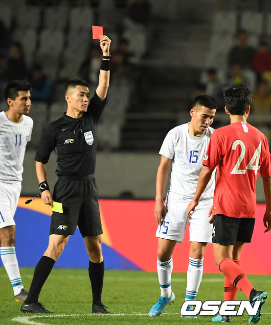 김학범 감독은 후반 시작과 동시에 장민규과 한정우를 빼고 정우영, 이유현을 투입했다. 후반 초반 김동현은 우즈베키스탄 이스마일로프의 발에 밟히는 파울을 당했다. 하지만 주심은 경고조차 주지 않았다.